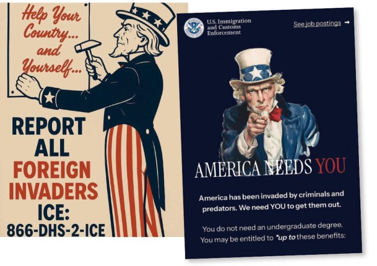 O recurso às referências de supremacistas brancos se proliferaram também na agência de imigração, conhecido pela sigla ICE, Immigration and Customs Enforcement. Um dos cartazes feitos pela agência questiona: “Qual o caminho, homem americano?”, frase em alusão ao livro Which Way, Western Man, escrito pelo supremacista William Gayley Simpson, apoiador de Hitler. Postagens nas plataformas digitais convocam os candidatos a empregos no ICE a “defenderem sua cultura!” Num anúncio ainda designado a buscar novos funcionários pela agência, o ICE alerta: “Estamos sendo invadidos”. Em outro cartaz, com uma estética dos anos 1930, o governo incentiva a população a denunciar vizinhos, caso haja uma suspeita de que estejam no país de forma irregular.