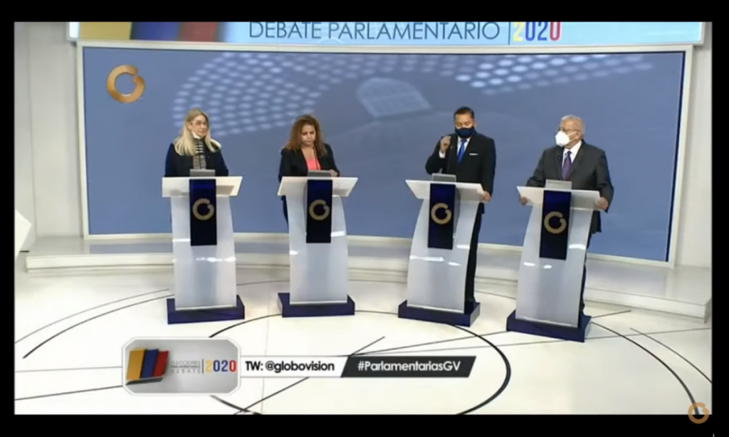 Em debate da emissora Globovisión, participaram Cilia Flores e Iris Varela, do Grande Pólo Patriótico, e Javier Bertucci e Bernabé Gutiérrez, da Aliança Democrática. Foto: Reprodução/YouTube
