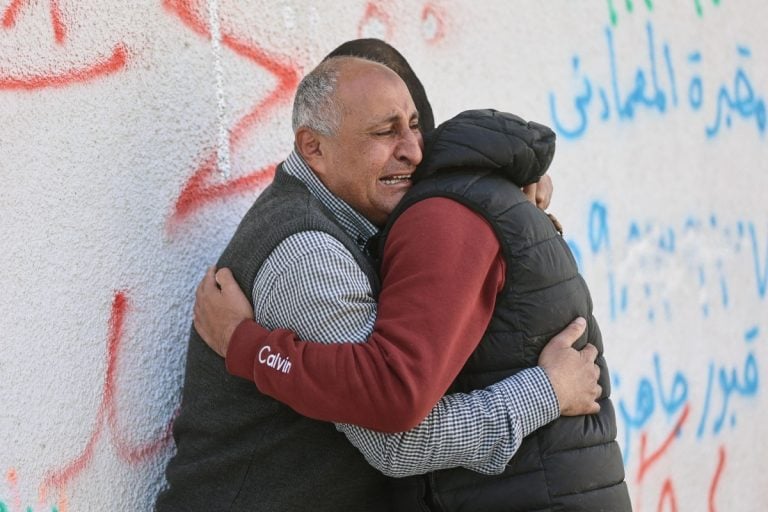 Palestinos se abraçam durante funeral em Gaza – foto: Omar Al-Qattaa/AFP