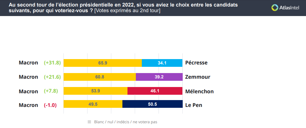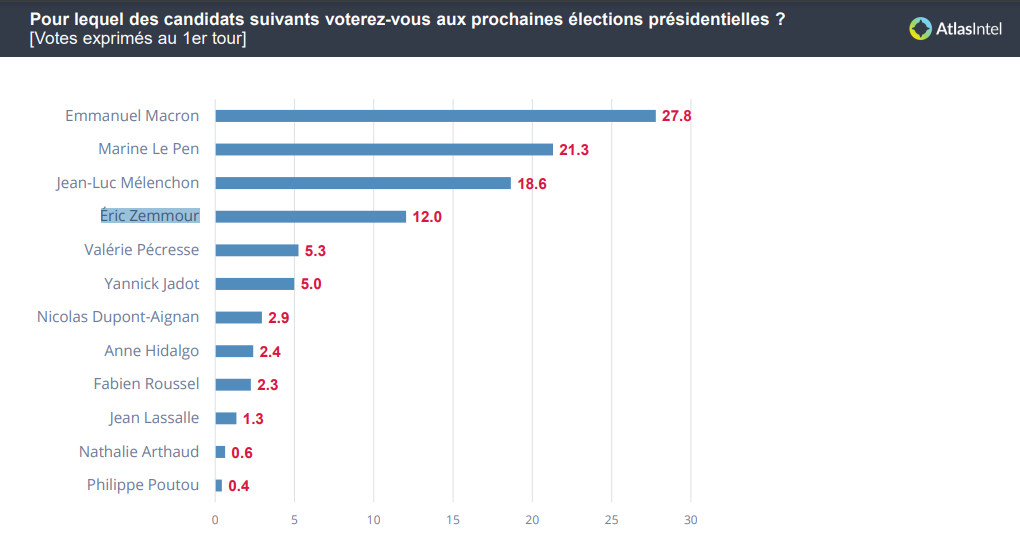 No primeiro turno, o atual presidente tem 27,8% das intenções de voto contra 21,3% de Le Pen. Na sequência, aparecem o esquerdista Jean-Luc Mélenchon, com 18,6%, e o extremista de direita Éric Zemmour, com 12%.