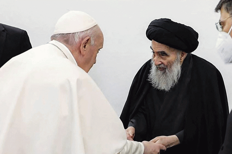 Com Maradona, com quem dividia a paixão pelo futebol e apoio ao peronismo. No inédito encontro com o aiatolá iraquiano Ali al-Sistani e com representantes indígenas na preparação do Sínodo da Amazônia – Imagem: Vatican Media/AFP, Sínodo Amazônia 2018 e Oseervatore Romano/AFP