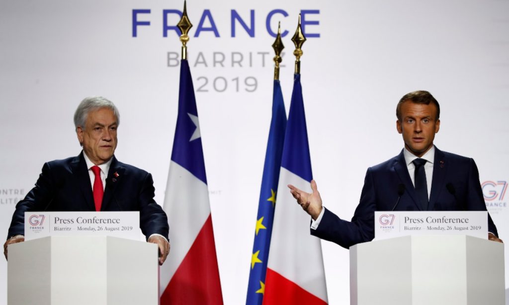 Os presidentes do Peru, Sebastian Piñera, e da França, Emmanuel Macron (Foto: FRANCOIS Mori /AFP)