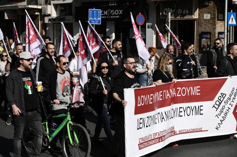 “O tempo de trabalho não é uma mercadoria, é nossa vida!”, afirma uma faixa no centro de Atenas, que também inclui o lema: “Não às 13 horas!”.