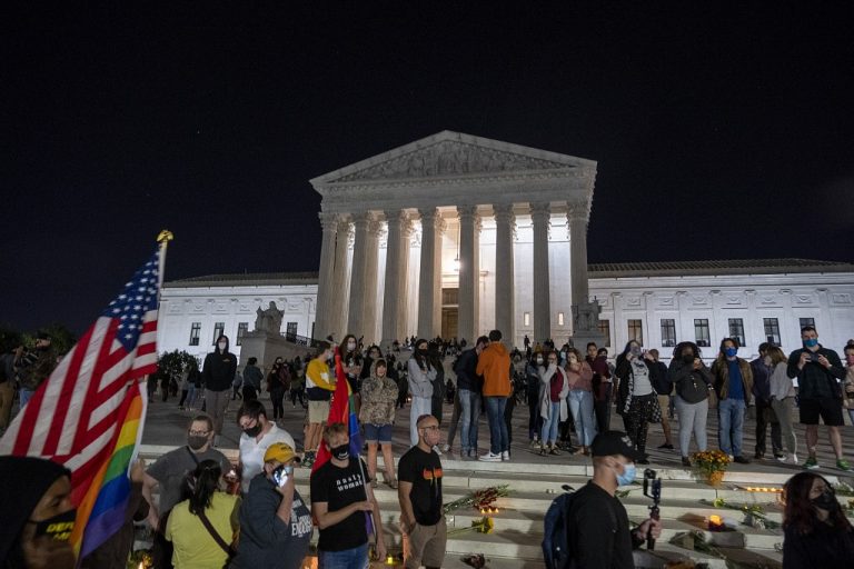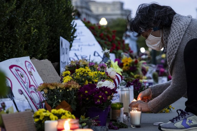 As bandeiras do Congresso e da Casa Branca foram hasteadas a meio pau na noite de sexta-feira, enquanto centenas de pessoas, incluindo muitos jovens, reuniram-se espontaneamente em frente à fachada da Suprema Corte para homenageá-la, levando velas e flores.