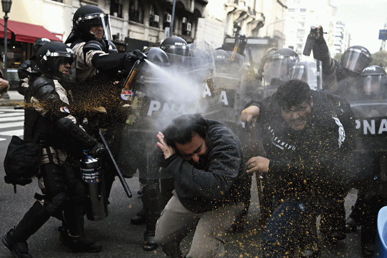 Sufoco. Os argentinos que protestam recebem em resposta jatos de água, gás lacrimogêneo, cassetetes e pontapés – Imagem: Luis Robayo/AFP e Juan Mambromata/AFP