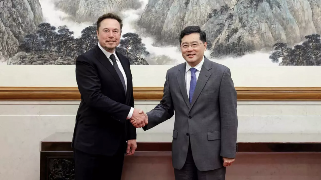 Musk e o ministro das Relações Exteriores da China, Qin Gang, em encontro realizado em maio de 2023. Foto: AFP / Chinese Ministry of Foreign Affairs