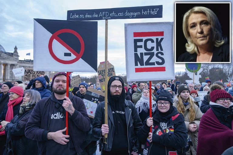Inimigos. Alemães protestam contra a xenofobia da AfD. Na França, Le Pen celebra a nova lei de migração – Imagem: Stefan Muller e Valentine Chapuis/AFP