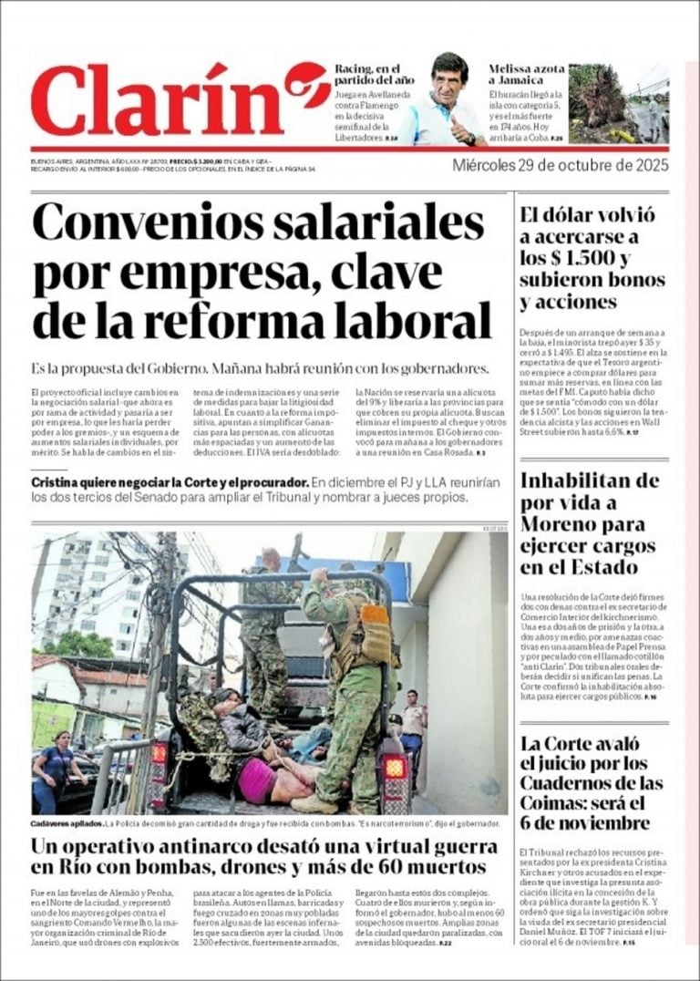 A capa da edição desta quarta-feira 29 do jornal Clarín, da Argentina. A publicação destaca a violenta operação policial no Rio de Janeiro. Foto: Reprodução