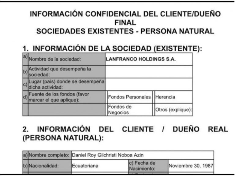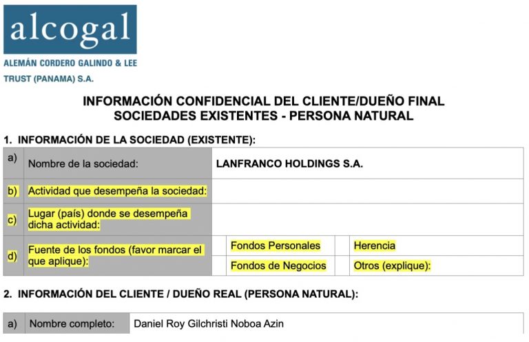 “Confirmamos que os beneficiários finais da sociedade acima referida são meus filhos Daniel Roy Gilchristi Noboa Azin e John Sebastian Maximilian Noboa Azin, já que estou deixando a sociedade para eles, sem que eles tenham conhecimento expresso disso no momento”, diz um dos documentos com data de 10 de junho de 2015, endereçado por Álvaro Noboa Ponton ao escritório de advogados Alemán, Cordero, Galindo & Lee (Alcogal), com sede no Panamá.