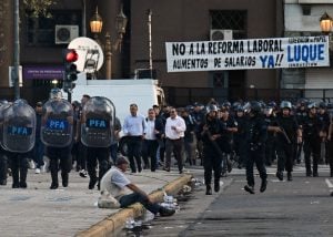 Sindicatos e organizações de esquerda se reuniram diante do Congresso, onde foram registrados confrontos na tarde de quinta-feira: garrafas e pedras foram lançadas contra os policiais, que responderam com jatos de água e gás lacrimogêneo.