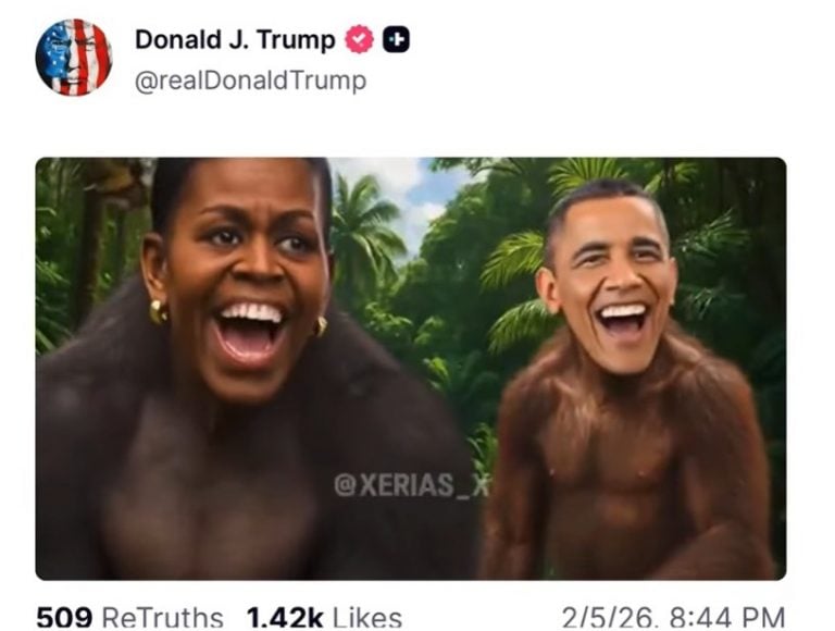 Ao final do vídeo de um minuto, publicado na plataforma Truth Social de Trump, os rostos dos Obama aparecem sobrepostos aos corpos de macacos por cerca de um segundo.