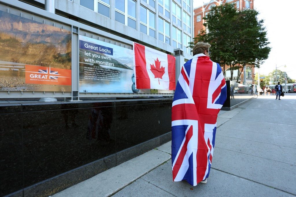 Ottawa, Canadá: Eissa Saddozai se enrolou em uma bandeira britânica, em frente ao Alto Comissariado Britânico: