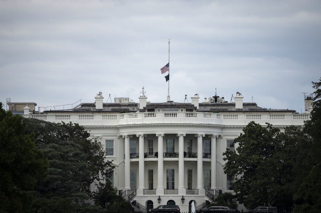 Washington DC, Estados Unidos: a bandeira norte-americana no topo da Casa Branca a meio-mastro: