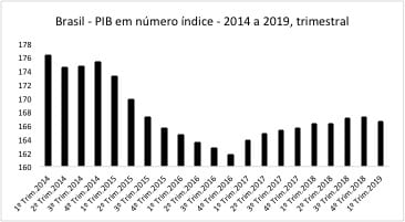 Trimestre após trimestre, desde 2014, a economia vem mostrando fraquezas. A taxa média de crescimento de 3% do período 2011-2013 foi perdida. A economia mergulhou no fundo do poço após dois anos de agudas recessões (2015 e 2016). A partir de 2017, estacionou na depressão.