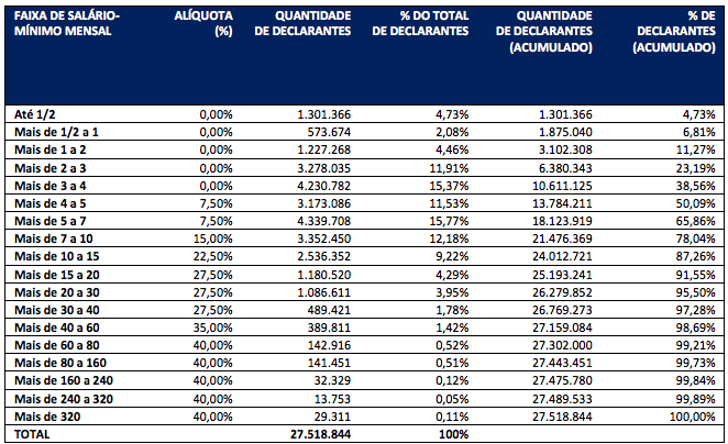 Nessa nova tabela, 38,55% dos declarantes ficariam isentos do IRPF, 48,70% seriam desonerados e 10,02% manteriam a alíquota atual. A tabela elevaria a tributação para apenas 2,73% dos declarantes, cerca de 750 mil contribuintes: 1,42% (390 mil contribuintes que recebem entre 40 e 60 Salários Mínimos) seriam onerados com a alíquota (35%), superior à atual: e 1,31% (360 mil contribuintes que recebem mais de 60 Salários Mínimos e acima de 320 Salários Mínimos mensais) (Figura 4).