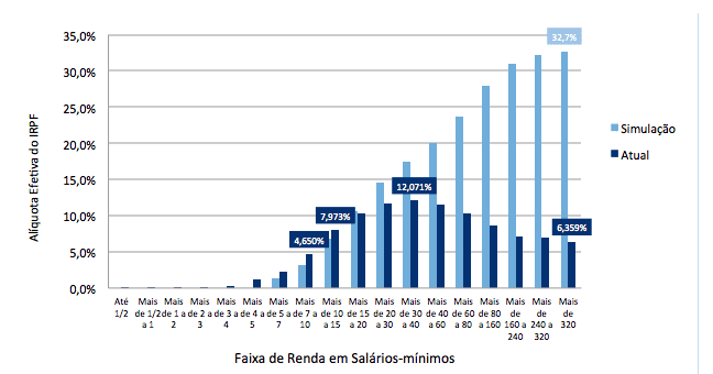 As mudanças propostas no IRPF corrigiriam uma das grandes anomalias da tributação brasileira: quem declara renda superior a 240 salários mínimos mensais tem aproximadamente 70% dos seus rendimentos isentos ou não tributáveis. Assim, na situação atual, quem ganha mais de 320 Salários Mínimos mensais, por exemplo, paga alíquota efetiva de IRPF de apenas 6,36% (um valor próximo de quem ganha entre 7 e 15 salários mínimos). Na situação proposta essa alíquota efetiva subiria para 32,7% (Figura 5).