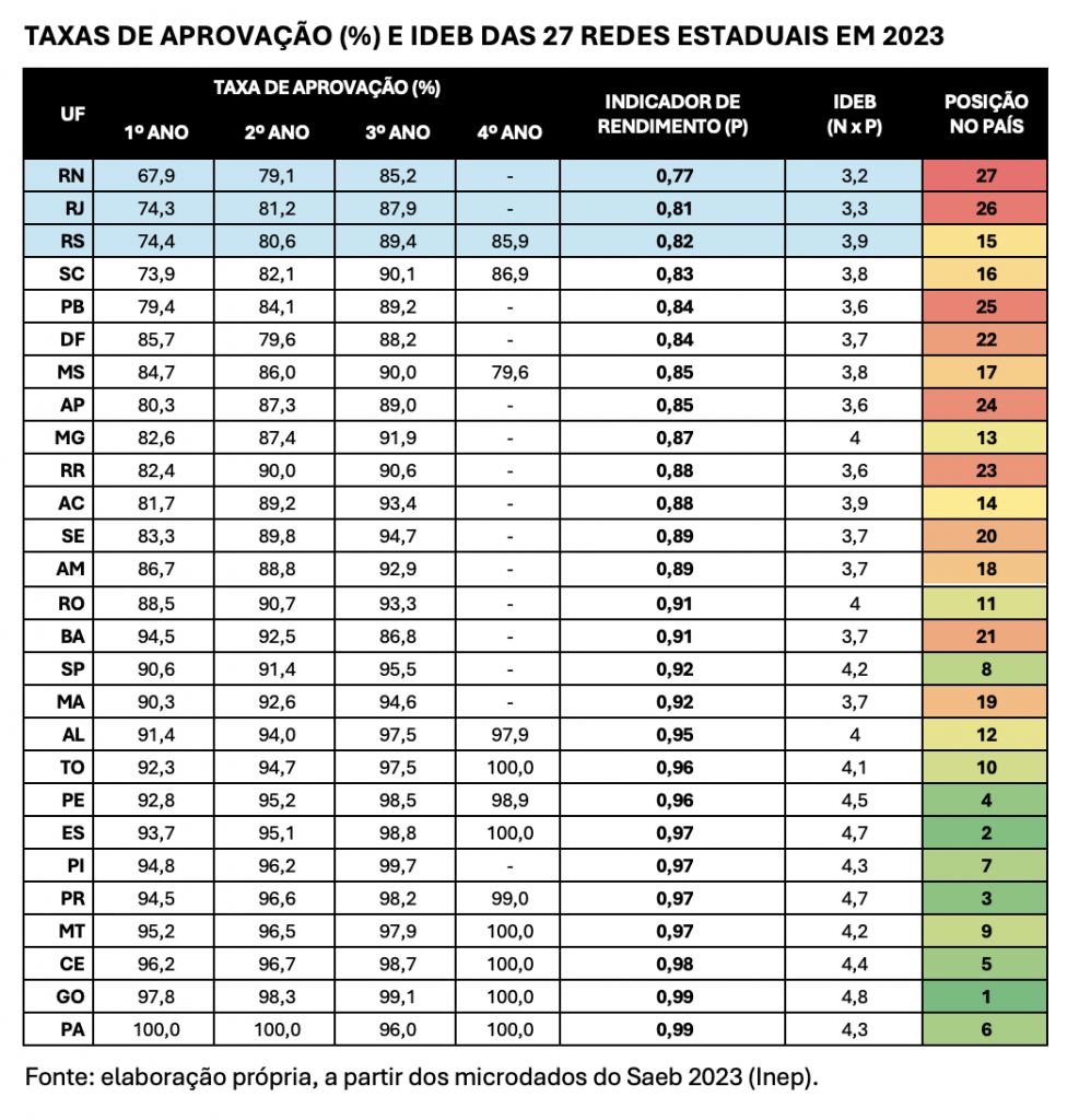 Os estados do Rio Grande do Norte e do Rio de Janeiro tiveram as menores taxas de aprovação no Ensino Médio do país, e ficaram nas duas últimas posições no “ranking” do último Ideb. Ao mesmo tempo, as sete redes estaduais com melhor Ideb do Brasil em 2023 também eram aquelas com as taxas de aprovação mais altas.