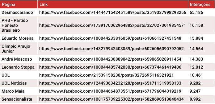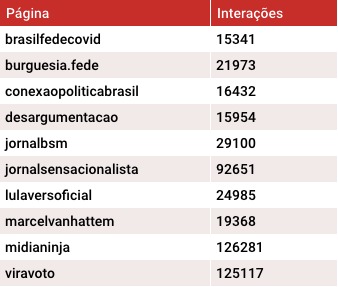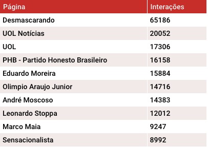 No Facebook, notamos que as páginas que conseguiram maior interação foram, em sua maioria, de apoiadores do ex-presidente Lula, enquanto temos duas páginas contrárias ao ex-presidente, duas de notícias e uma de humor. As duas páginas anti-Lula não são páginas de apoiadores de Bolsonaro. Por sua vez, dentro do campo lulista temos perfis importantes como o Desmascarando e o perfil do petista Marco Maia, que é uma das maiores páginas de petistas no Facebook.