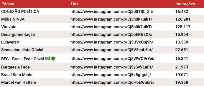 No Instagram, a distância se torna ainda maior. O campo lulista continua dominando os dois rankings com seis páginas, contra duas páginas anti-Lula, uma de humor e uma de notícias. A página da Mídia Ninja, lidera os dois rankings, enquanto as páginas que criticam Lula não são de nenhum dos principais personagens do bolsonarismo.
