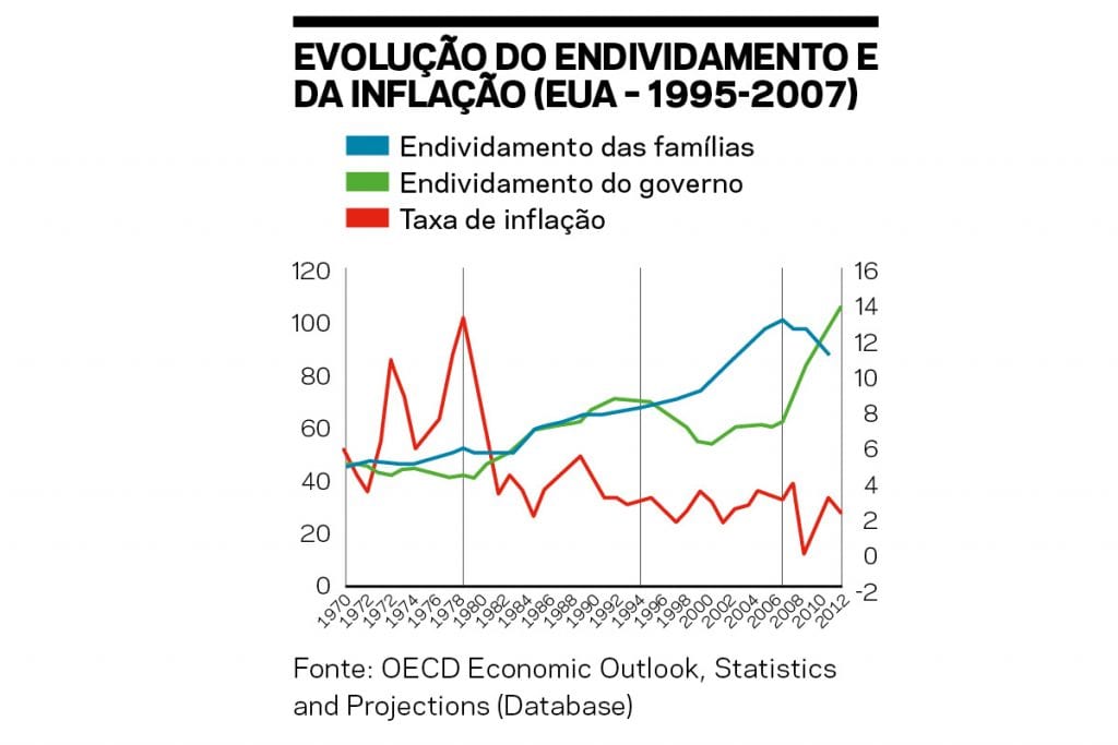 O gráfico abaixo revela a evolução do endividamento das famílias e do governo, bem como a inflação nos Estados Unidos, entre 1970 e 2012. No período 1995-2007 a relação dívida pública-PIB cai, enquanto a dívida das famílias cresce aceleradamente, como é demonstrado pela inclinação das curvas. Depois da crise de 2007-2008, a desalavancagem das famílias é acompanhada por uma aceleração do endividamento público. A inflação manteve-se deprimida, assim como o gasto fiscal, os salários e o investimento privado.