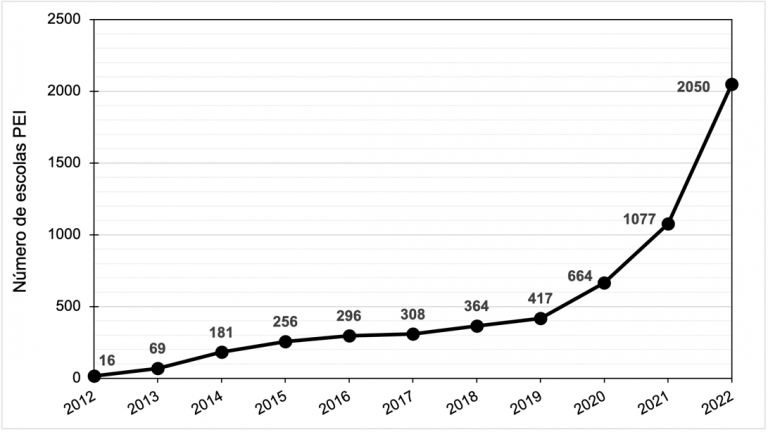 Expansão do PEI na rede estadual paulista, 2012-2022 (Fonte: elaboração própria, a partir de dados da Seduc-SP)
