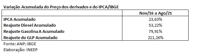 Como resultado, o custo ficou para a sociedade brasileira, como mostra a tabela abaixo que destaca a evolução do IPCA/IBGE e dos preços da Gasolina A, do Diesel e do GLP (gás de cozinha), entre outubro de 2016, quando a política foi adotada, e agosto de 2021. O preço do Diesel, que foi subsidiado em parte do período em destaque, subiu mais que duas vezes acima do custo de vida; a gasolina A, mais de três vezes e o GLP, que afeta diretamente a renda do estrato mais pobre da população brasileira, cresceu 211,26% no período, enquanto o IPCA acumulou 23,63%.