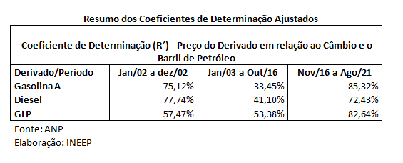 Esse período de implantação da política do “Hedge Ampliado” permanente, apresenta forte determinação dos preços dos derivados no mercado brasileiro por parte do câmbio e do barril do Brent. Não fosse a política de subsídio ao diesel implantada em 2017 que permitiu que o preço do diesel não acompanhasse diretamente as flutuações do preço no mercado internacional e do câmbio, o coeficiente de determinação seria maior que 80% nos três derivados em destaque, entre nov./16 e ago./21.