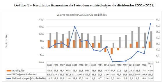 Em 2021, do total de dividendos distribuídos até o segundo trimestre de 2021 (31,6 bilhões), cerca de 11,6 bilhões de reais (ou 36,8%) irão para o Governo Federal e BNDES; outros 7,7 bilhões (22,7%) para os acionistas privados brasileiros; e, por fim, a maior fatia dessa riqueza produzida (40,6%) irá para acionistas não brasileiros, ou seja, 12,8 bilhões. O que levanta uma questão: haverá valorização dos trabalhadores da Petrobras em 2021 ou apenas remuneração dos acionistas?