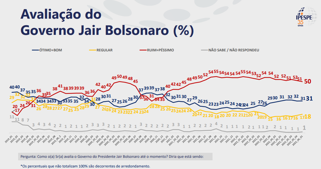 Desde o início de 2022, houve um recuo acumulado de 5 pontos percentuais, segundo o instituto. Esta é melhor marca para governo desde junho de 2021. Os que consideram a administração como boa ou ótima ficaram estáveis em 31%, enquanto os que a avaliam como regular oscilaram de 17% na semana anterior para 18% agora.