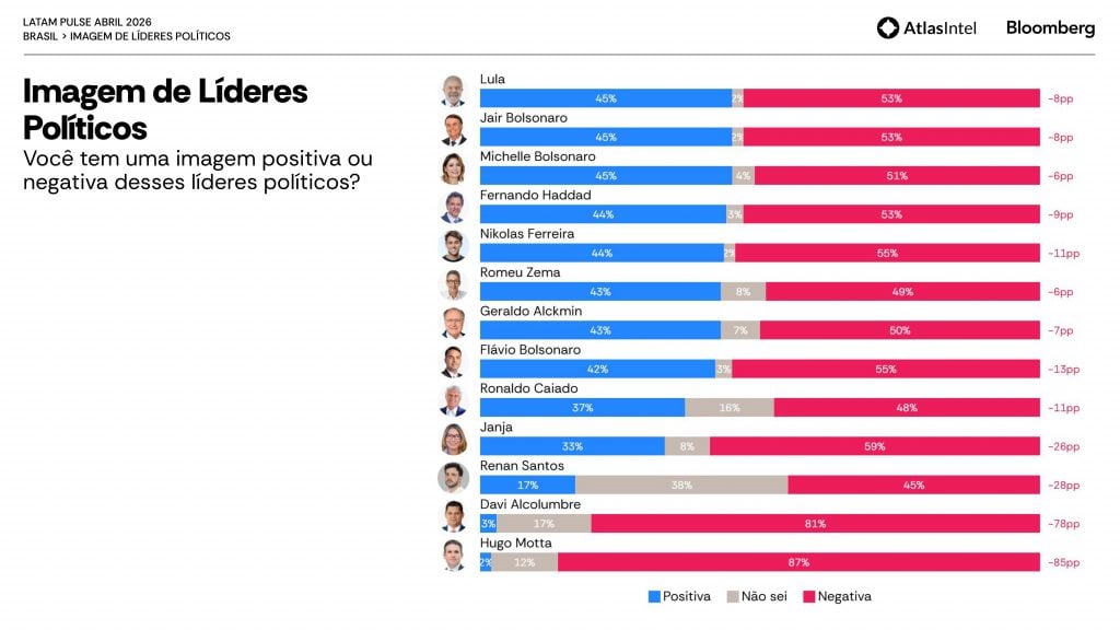O presidente Lula (PT) e o ex-presidente Jair Bolsonaro (PL) contabilizam, cada um, 45% de imagem positiva e 53% de negativa.