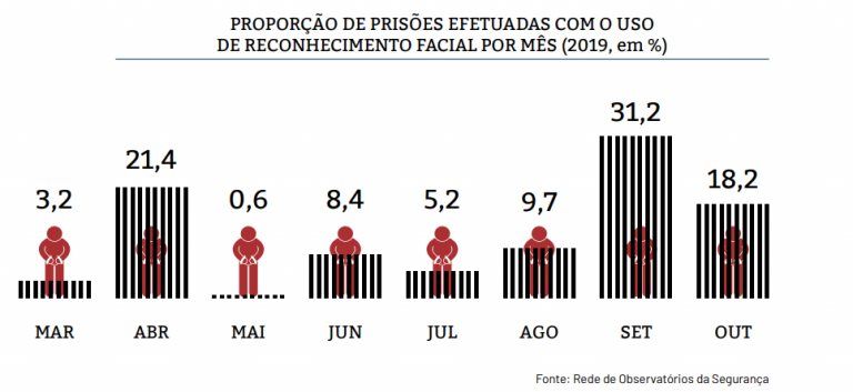 Em um estudo feito pela Rede de Observatórios de Segurança, liberado na quinta-feira 21, 90,5% das pessoas presas pelo uso da tecnologia e identificáveis pela cor da pele eram negras. Das 191 pessoas presas, apenas 42 possuíam fotos.