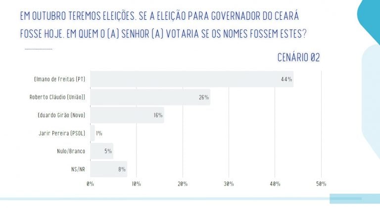O segundo teste feito pelo instituto com Ciro e Elmano é de disputa direta, sem a presença de outros potenciais candidatos. Nesse cenário, os eleitores cearenses apontam uma divisão total: 44% para cada candidato. Nulos, brancos e indecisos, quando somados, chegam a 12%.