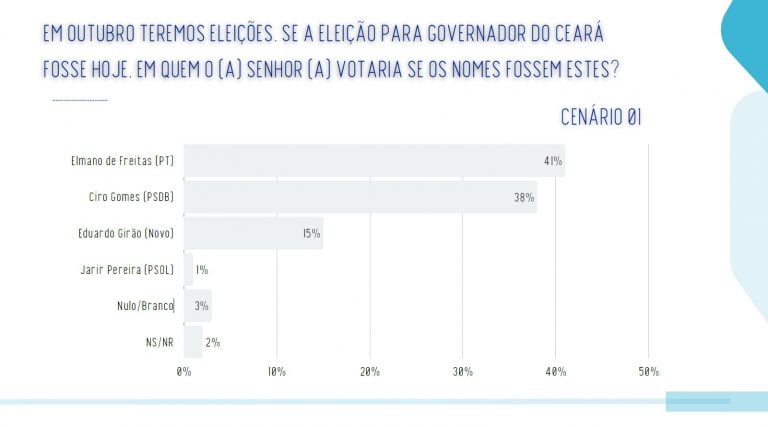 De acordo com a pesquisa, Elmano e Ciro estão tecnicamente empatados em dois cenários testados. A margem de erro, convém registrar, é de dois pontos percentuais, para mais ou para menos.