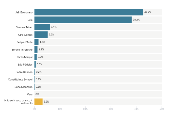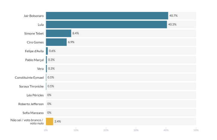 De acordo com o levantamento, no Rio Grande do Sul, o ex-capitão tem 40,7% das intenções de voto contra 40,2% do petista. Na sequência, aparecem Simone Tebet (MDB), com 8,4%, e Ciro Gomes (PDT), com 6,9%. Os demais candidatos não chegaram a 1%.