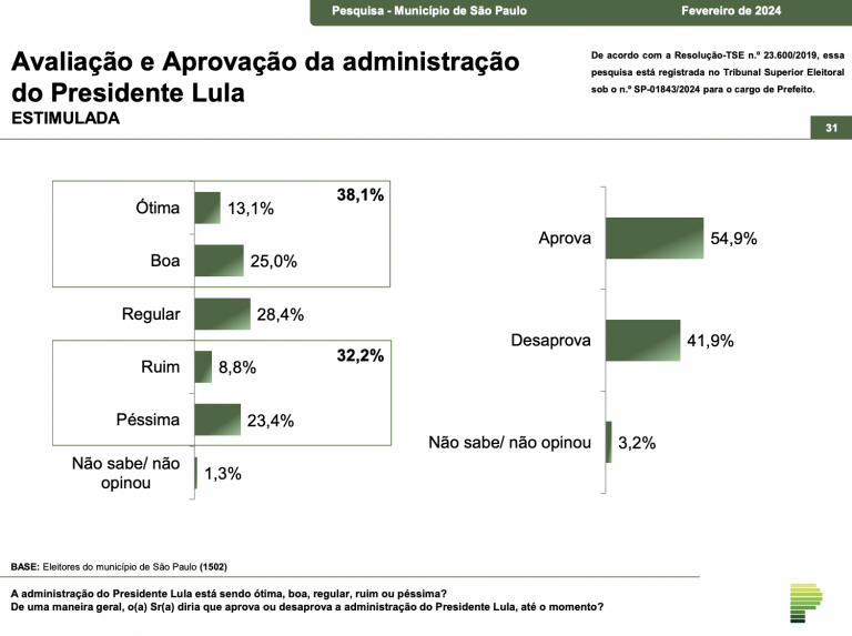 O governo do presidente Lula (PT) tem aprovação de 54,9% dos eleitores da cidade de São Paulo. O índice foi registrado em novo levantamento do instituto Paraná Pesquisas, divulgado nesta terça-feira 20. A taxa de reprovação apontada é de 41,9%.