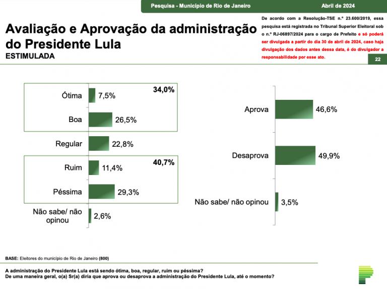 Segundo os dados da pesquisa, Lula é reprovado por 49,9% dos eleitores da capital fluminense, enquanto outros 46,6% aprovam o trabalho realizado pela gestão do petista. Há outros 3,5% que não souberam responder ou preferiram não opinar na questão.