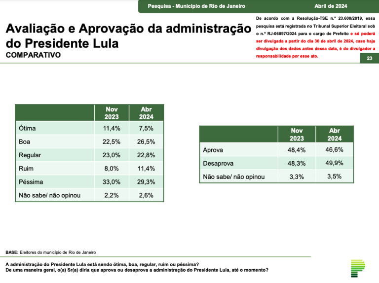 Os resultados da pesquisa desta terça-feira revelam também uma piora da avaliação do governo Lula quando comparado ao levantamento anterior do instituto. Em novembro do ano passado, Lula tinha aprovação de 48,4% dos eleitores da capital do Rio. Outros 48,3% desaprovavam o terceiro mandato do petista no Planalto. Os dados mostravam um empate técnico entre as avaliações.