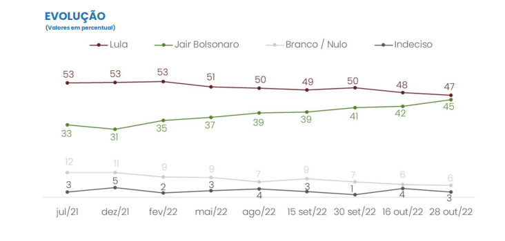 Até agora, o único levantamento que indica uma evolução de Bolsonaro nas intenções de voto é o da CNT/MDA divulgado neste sábado. De acordo com a pesquisa, Lula tem 46,9% das intenções de voto contra 44,9% do ex-capitão. Nos votos válidos, quando são excluídos os brancos e nulos, o ex-presidente chega a 51,1% e o candidato à reeleição fica com 48,9%.