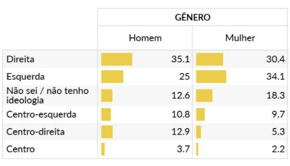 Os dados indicam que a direita domina entre os homens (35,1%) – entre as mulheres, 30,4% se declararam de direita. A esquerda marca 25% dos homens e 34,1% das mulheres, segundo o levantamento.