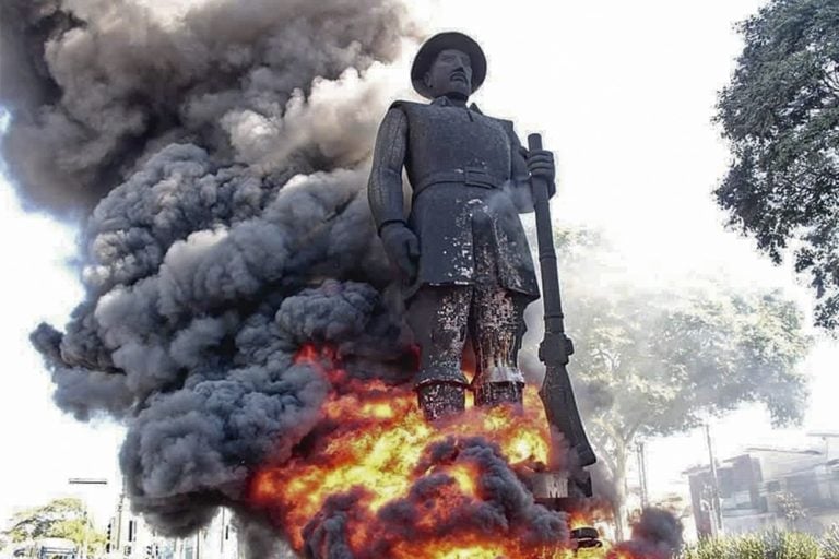 Revolta. Os manifestantes não pouparam a homenagem ao bandeirante – Imagem: Redes Sociais