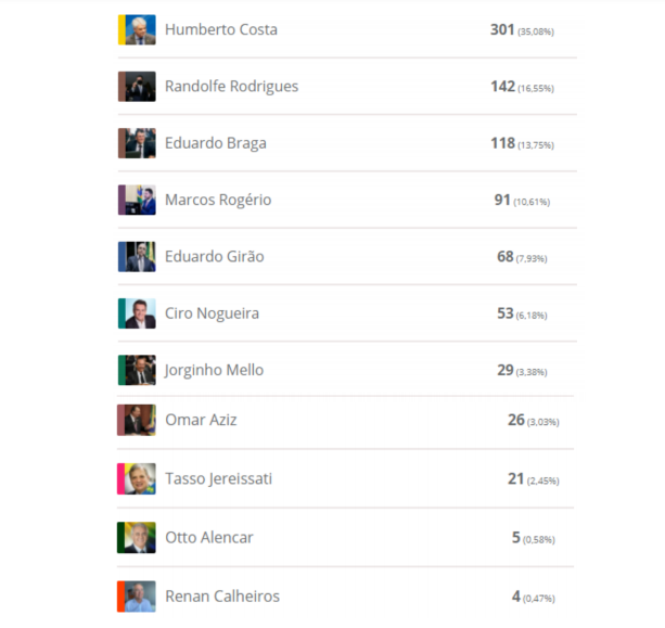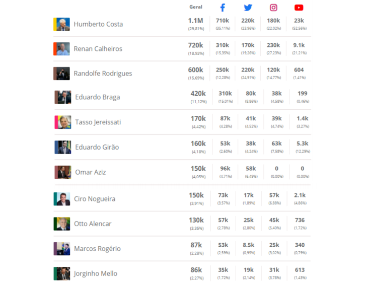 O líder é Humberto Costa (PT-PE), que tem mais de 1 milhão de seguidores.
