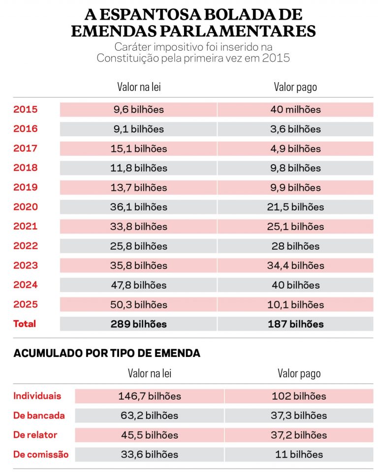 Emendas são obras inseridas por deputados e senadores no orçamento. O gigantismo financeiro das liberações e seu caráter impositivo reconfiguraram a política. A partir de 2015, o Congresso mudou várias vezes a Constituição para obrigar o governo a direcionar às emendas uma fatia da receita e a liberar o dinheiro sem interferência ou negociação. De lá para cá, o bolo totalizou 289 bilhões de reais, dos quais 187 bilhões foram efetivamente gastos. A cifra anual saltou de 9 bilhões em 2015 para 50 bilhões em 2025. O Legislativo controla 1 de cada 4 reais que o governo tem para gerir livremente. Nasceu um parlamentarismo disfarçado, uma situação que Dino descreveu assim em um despacho de dezembro passado: “Não é excessivo afirmar que hoje, no mundo, há os países: a) presidencialistas; b) parlamentaristas; c) semipresidencialistas; e d) o Brasil, com um sistema de governo absolutamente singular”. E está certo isso?, indagou ao magistrado o presidente de Portugal, Marcelo Rebelo de Sousa, durante visita ao STF em 18 de fevereiro. Resposta: “Me pergunto isso todo dia”.