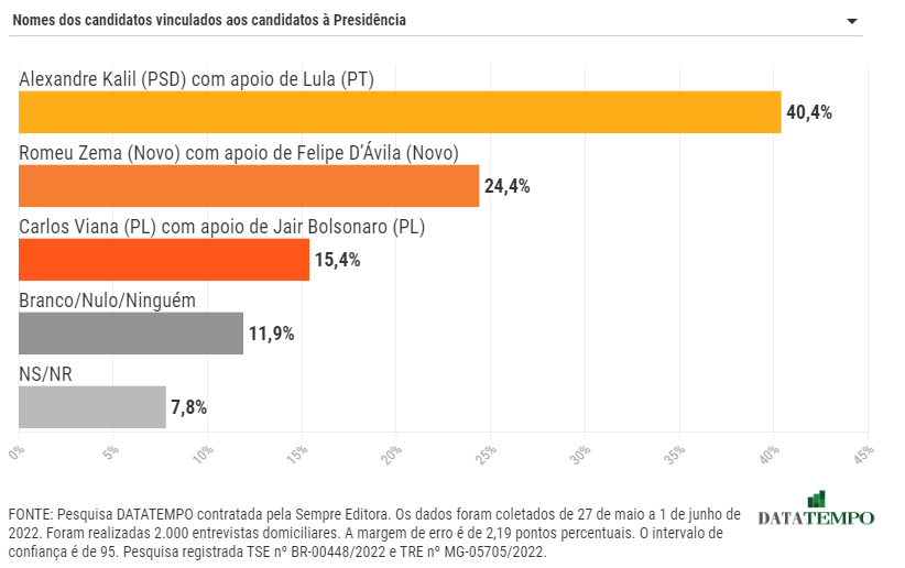 Pesquisa DataTempo divulgada na segunda-feira 7 mostra que o pré-candidato ao governo de Minas Gerais pelo PSD, Alexandre Kalil, lidera a corrida eleitoral quando tem a imagem associada ao ex-presidente Lula (PT).