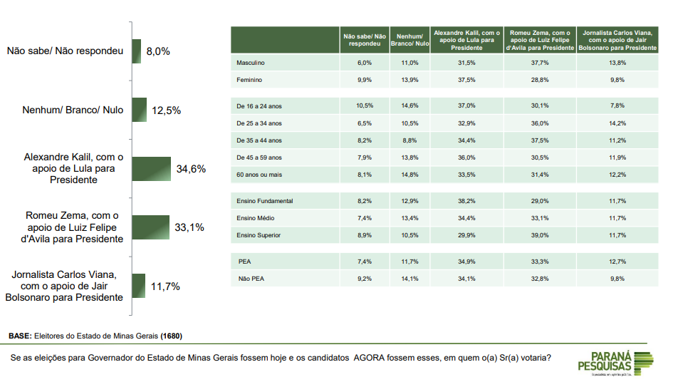 Neste cenário, Kalil marca 34,6% contra 33,1% do atual governador Romeu Zema (Novo), que seria apoiado pelo presidenciável do seu partido, Luiz Felipe D’Avila. O senador Carlos Viana (PL), quando apresentando ao lado do presidente Jair Bolsonaro (PL), soma 11,7% das intenções de voto.