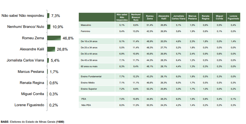 No principal recorte monitorado pelo instituto, sem o apoio dos presidenciáveis, Zema chega aos 46,8%, enquanto Kalil fica com 26,8%. Viana aparece com 5,4%.