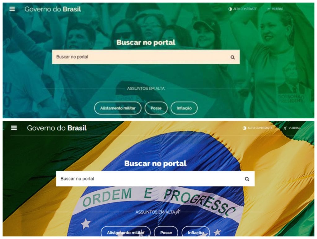 O site do governo registrou um episódio parecido. A página principal do portal exibiu por alguns dias a foto de uma manifestação na qual se lia as frases ‘Bolsonaro Presidente’ e ‘Meu Partido é o Brasil’ em camisetas. O plano de fundo foi trocado e, desde ontem, mostra em close uma bandeira.