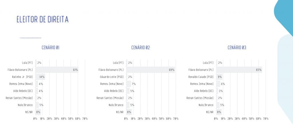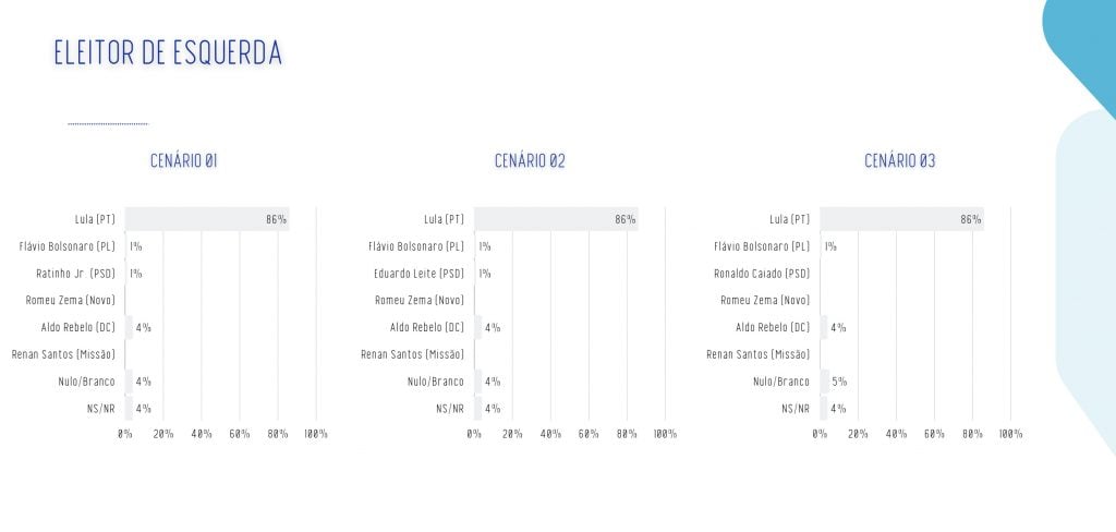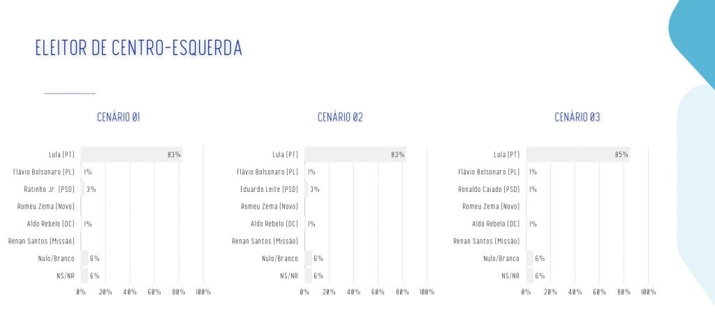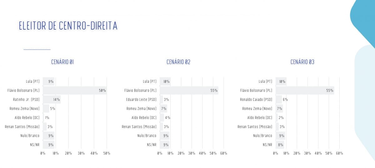 Os presidenciáveis do PSD aparecem como a terceira força no eleitorado de “centro”: Ratinho Junior marca 15% no cenário em que é testado, Eduardo Leite desponta com 12% e Ronaldo Caiado (PSD) chega a 11%.