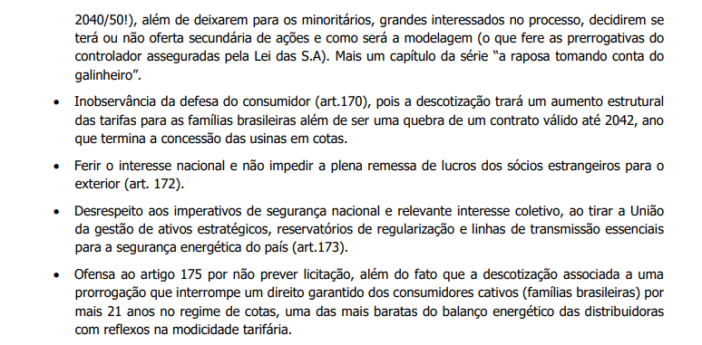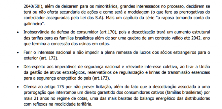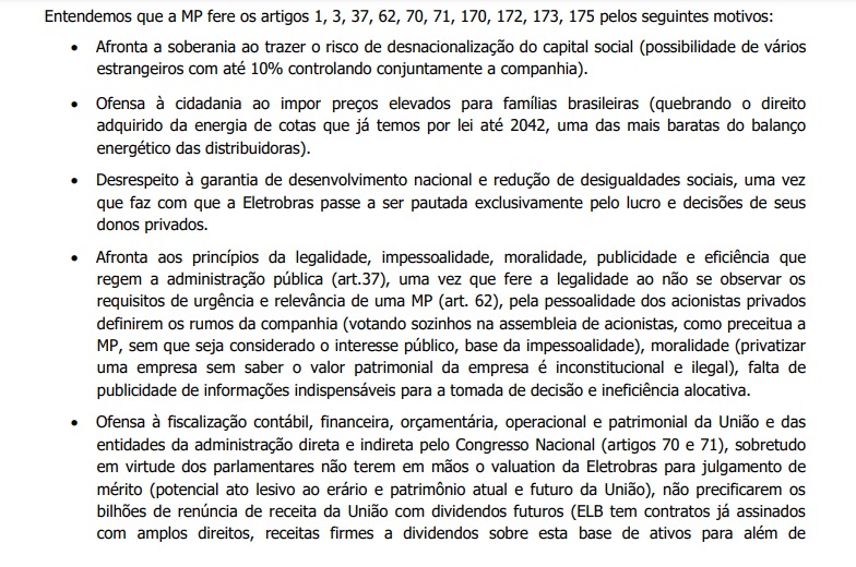 A Associação de Empregados da Eletrobras protocolou, no Tribunal de Contas da União, uma denúncia em que aponta inconstitucionalidades na Medida Provisória. De acordo com o documento, a MP fere os artigos dez artigos da Constituição.