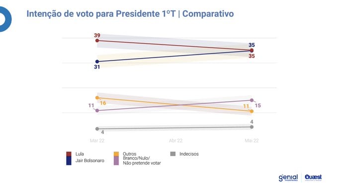 Desde o levantamento anterior, feito em março, o petista caiu 4 pontos percentuais e o ex-capitão cresceu 4. A margem de erro é de 2.8 pontos percentuais com 95% de confiabilidade. O instituto entrevistou 1200 eleitores entre os dias 12 e 15 de maio.