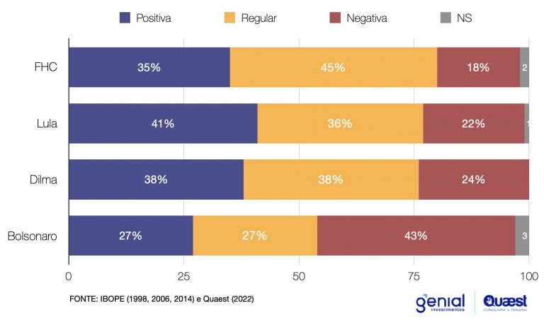 A Quaest desta quarta também mediu os níveis de rejeição e aprovação do governo Bolsonaro. Ao todo, 43% dos entrevistados dizem que o ex-capitão faz um trabalho ruim. Só 27% avaliam positivamente o trabalho do atual governo.